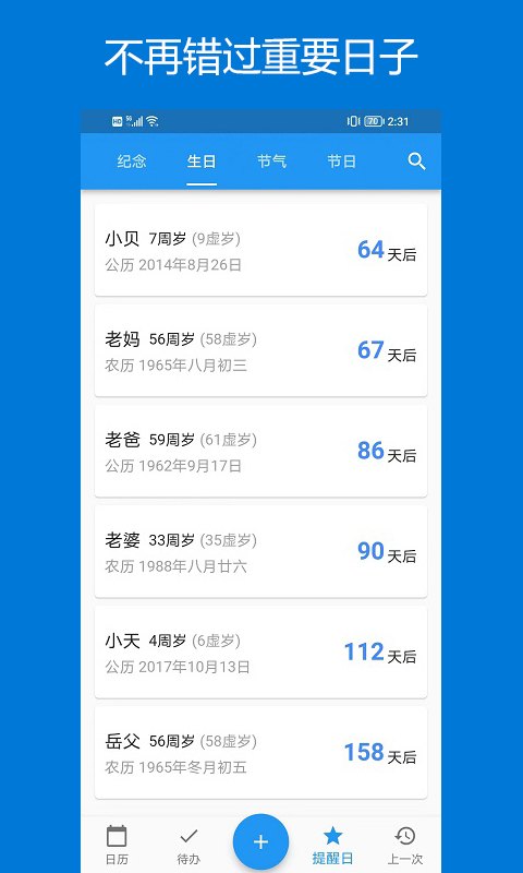 让你不会错过每一个值得纪念的日子,例如结婚/入职/升学/恋爱等。