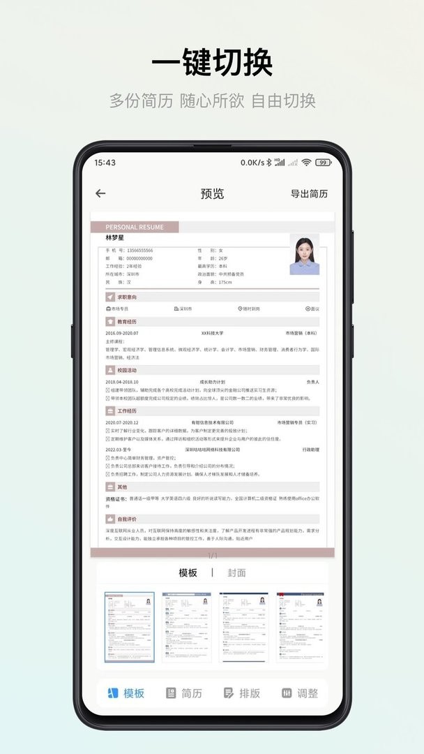 众多精美简历模板,简历制作一键切换,方便快捷。
