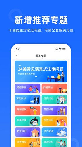 细分14类推荐专题服务,包含婚姻家庭、交通事故、劳动纠纷、借贷纠纷、雇佣侵权、赡养问题、刑事犯罪、医患纠纷、物业纠纷、遗产继承、消费维权、旅游纠纷、产品质量、企业用工。每一类都有专属全套法律服务及解决方案。