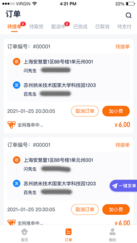 5. 切换到订单中心查看待接单栏目下订单,选择订单点击取消或立即加小费。