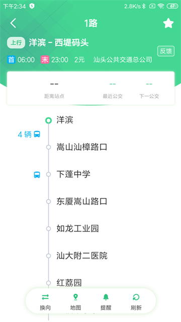 4. 可以看到公交车的所在位置以及下一站公交到达时间,下方还可以进行换向、开启下车提醒、刷新车辆,最后经常走的路线可以点击右上角进行收藏。