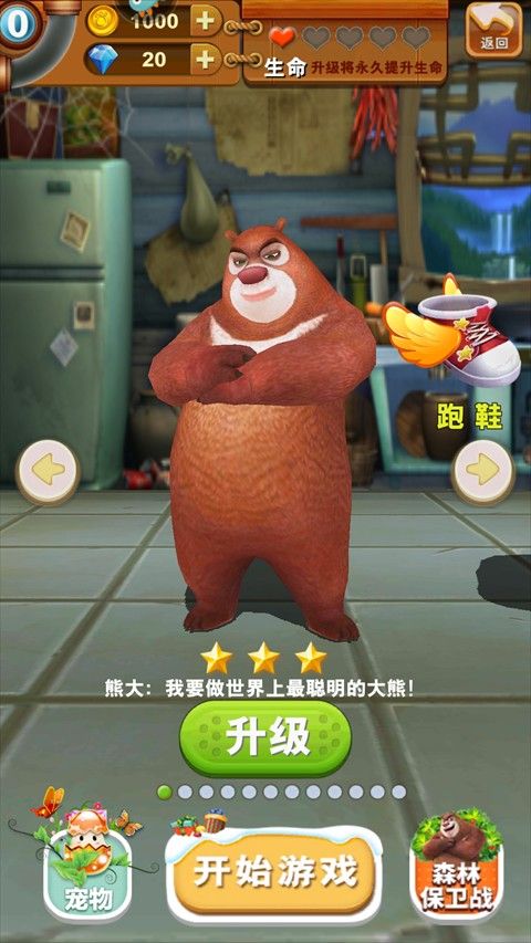 特色:游戏中的熊大和动画片中的一样,它最爱说的一句话就是做世上最聪明的大熊是一件幸福的事情。虽然一开始没有什么技能,但会随着升级来提升技能。
