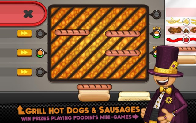 1. 记录好客人的需求后,就可以来到第一步煎烤肠,这一步的关键就是翻面时机,待一半的颜色变成橙色后就点击翻面,待另一面变成同样的颜色后就可以拿出来了。