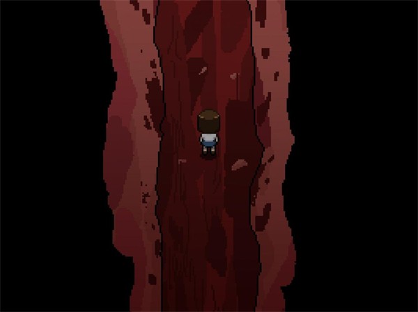 6. 进入左侧房间F后击杀两只小怪物,调查上方有血的墙壁,进入隐藏房间一(乐园)。离开房间F回到通道E,右下进入房间G。房间G右下角有存档点,地板有陷阱需绕行。