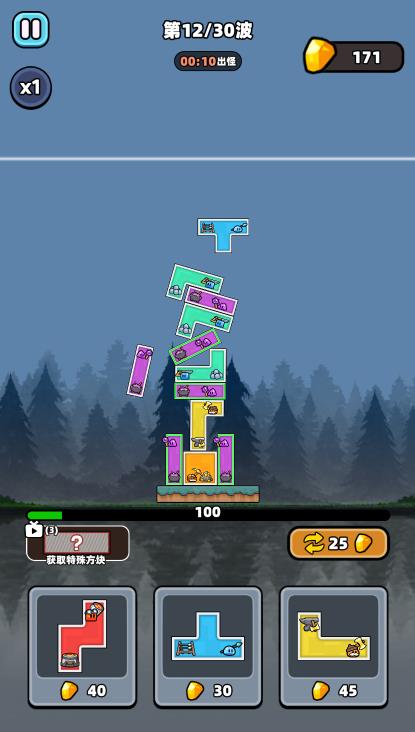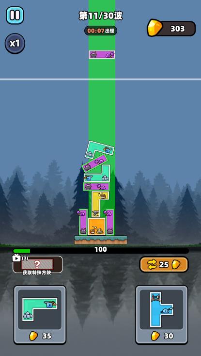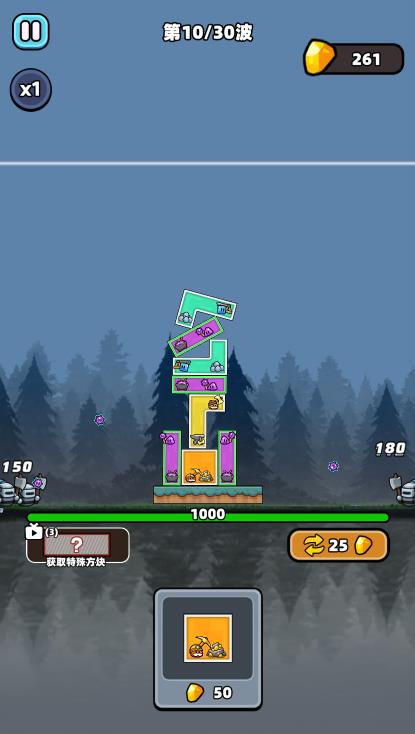 4. 每一波都会出现不同的敌人来进攻你的基地,消灭敌人可以获得金币来购买新的方块。