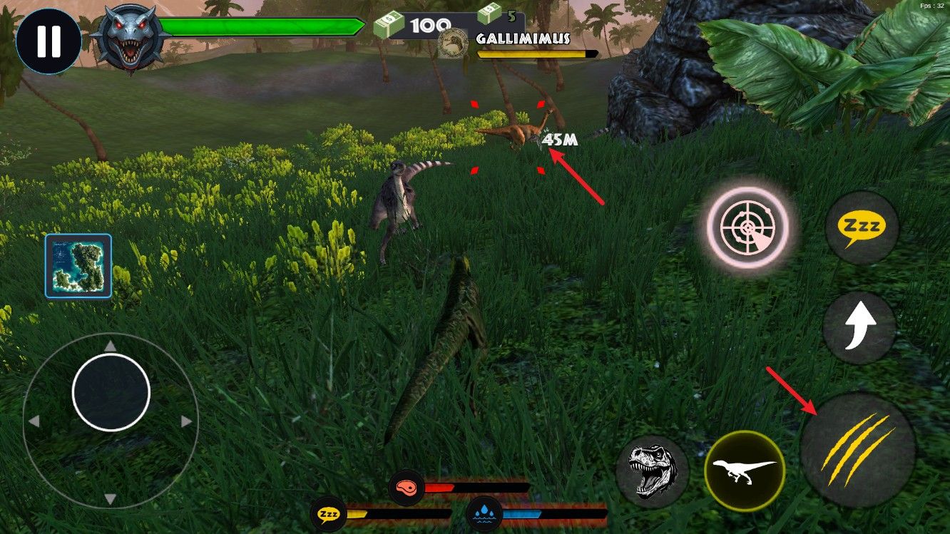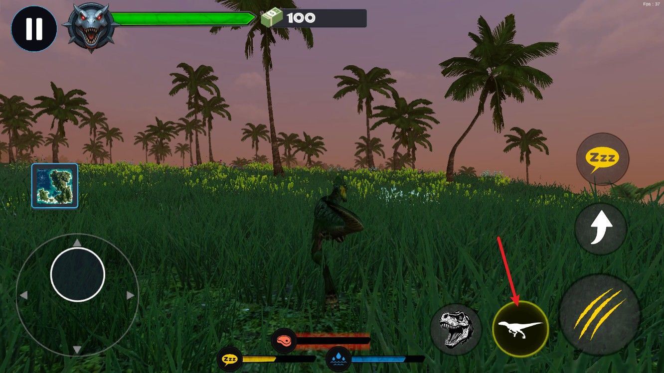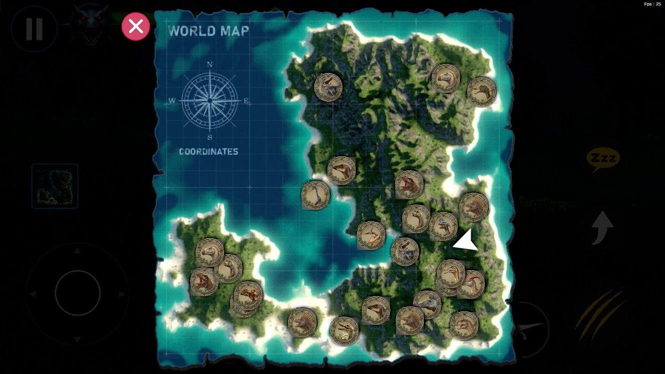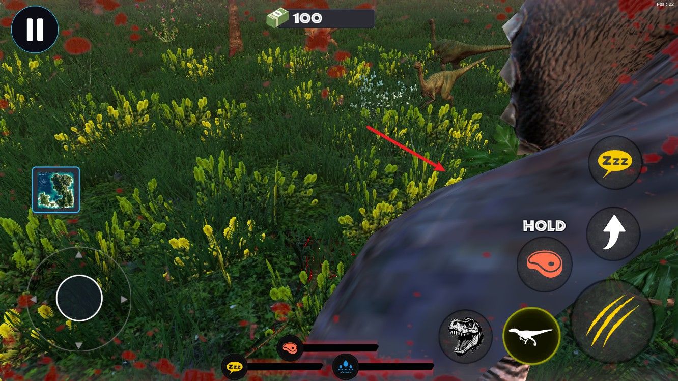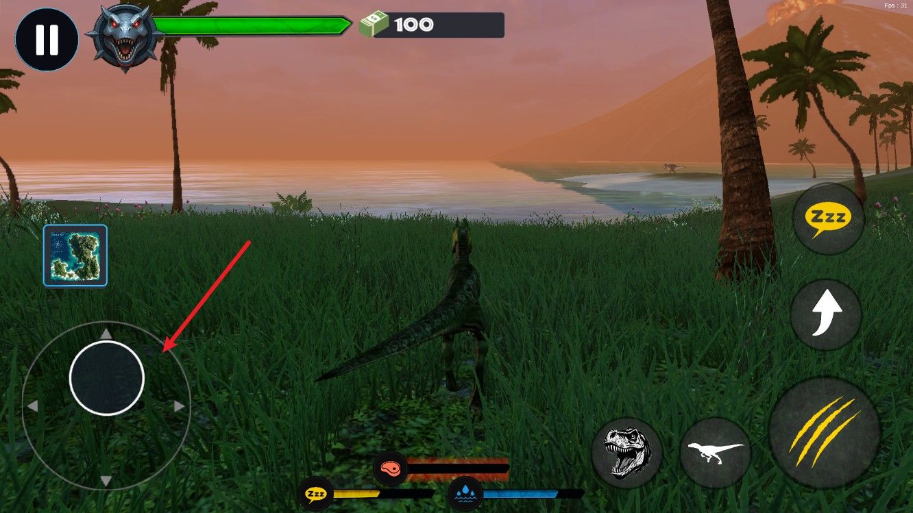 2. 屏幕左侧的虚拟摇杆,控制恐龙的移动方向,长按可实现持续移动,方便追击或躲避敌人。