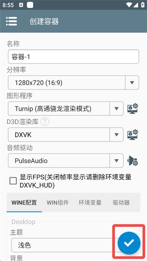 2. 选择屏幕分辨率,以及设定显存大小(配置较低的手机显存和分辨率要小点),点击右下角√图标创建。