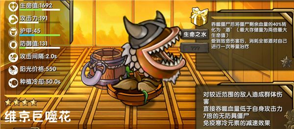 对较近范围的敌人造成群体伤害,直接吞噬血量低于自身攻击力7倍的无防具僵尸,免疫寒冷元素的减速效果。