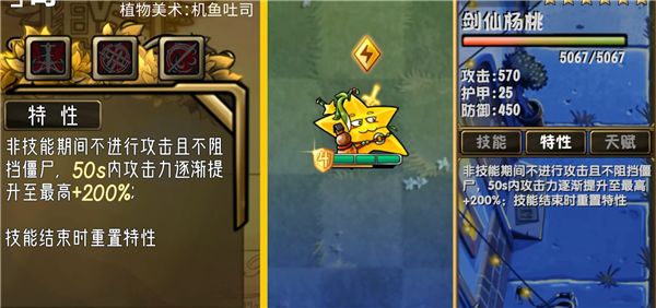 非技能期间不攻击、不阻挡僵尸;50 秒内攻击力逐渐提升至 + 200%。技能结束后重置特性,状态会随特性增益变化。