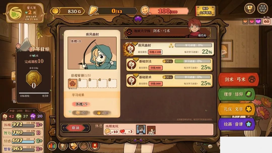 2. 四维:体魄、智力、情感、想象,可以理解为熟练度,主要影响完成课程的效率。长满一条上升一个等级,给一个天赋点,一共9级,整个游戏最多可以有36个天赋点。