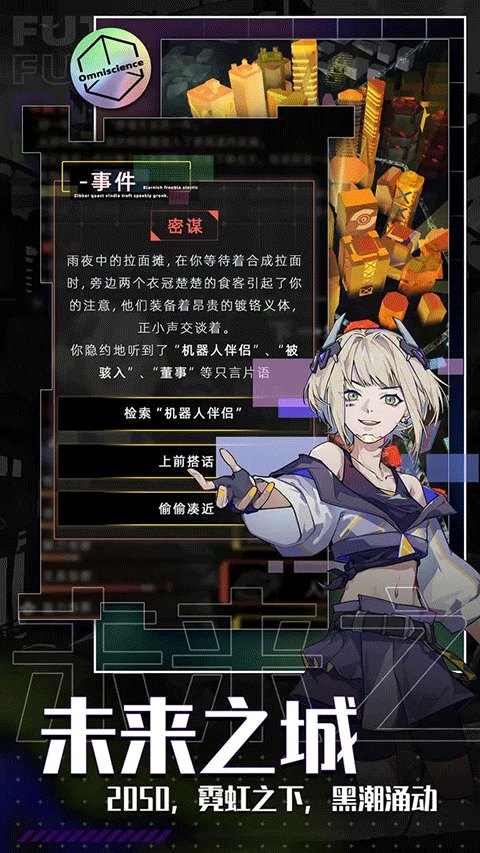 你想要体验不一样的未来人生吗?在未来人生手游中,我们将扮演随机居民,体验不一样饿人生百态。游戏以独具特色的赛博朋克画风为主,为我们构建了一个独特的未来世界,在这里我们可以当职员、做佣兵、开游艇,甚至用机械和武器迎战劲敌!而且游戏是以关卡闯关的方式进行,通过不断解锁关卡来解锁我们的不同人生,你的人生未来,就在你的手中!