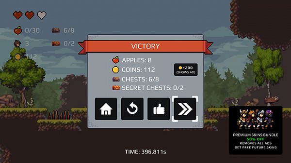 11. 通关后可获得苹果、金币、宝箱等奖励,选择【双箭头号】图标可进行下一关,
