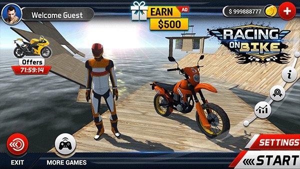 极速摩托英文名为Racing on Bike,游戏在画面上采用了顶尖的3D引擎技术打造,以经典ip暴力摩托为原型题材设计,为玩家打造了一个全新的模拟赛车玩法。而且游戏还为玩家准备了炫酷的机车和各种高难度地形可供玩家进行选择,玩家可以体验更多竞速快乐!
