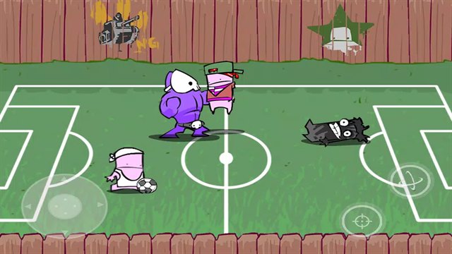 提示:可以把球踢进球门,还会加分(分数在背景上)。当你持足球时,小孩会铲你的球,被铲倒会伤血!