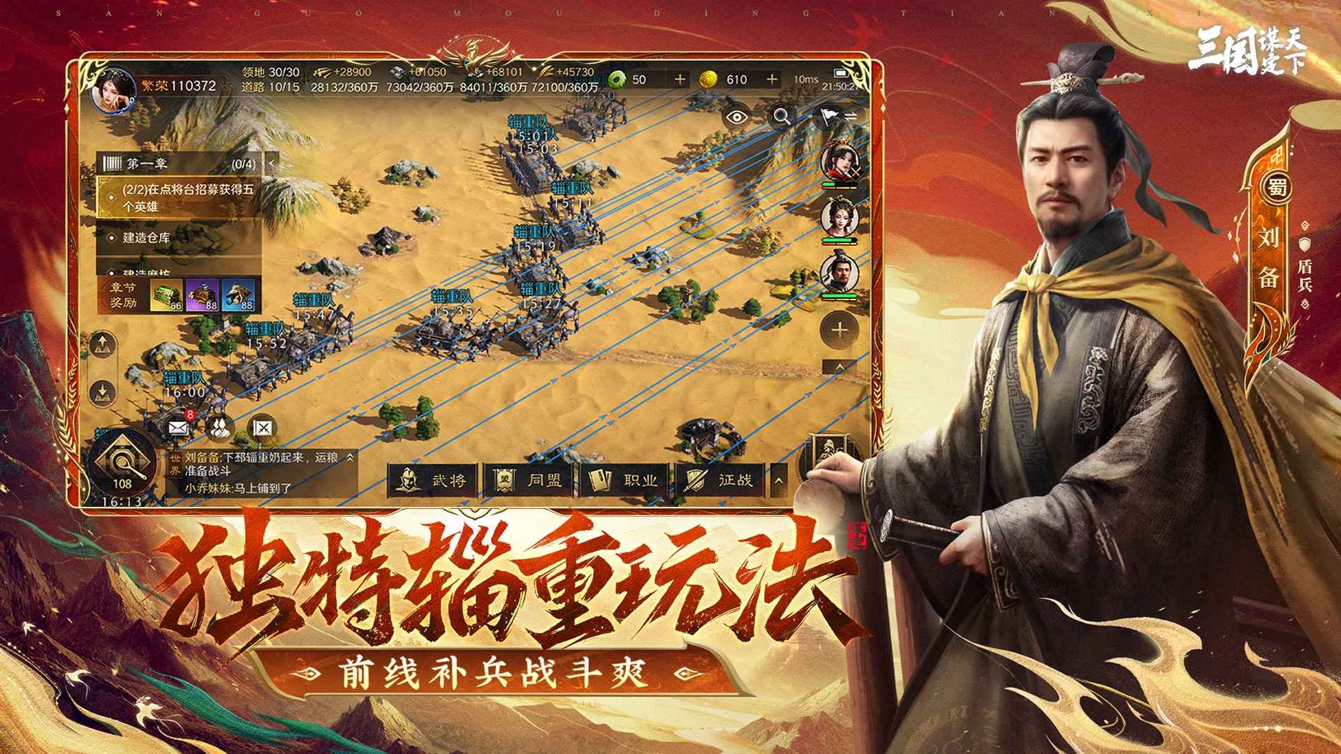 身处三国乱世,你可以扮演运筹帷幄的奇佐、征战沙场的镇军、出奇制胜的神行、悬壶济世的青囊、屯田发育的司仓和巧制机关的天工。或是神行的隐身奇兵和飞地绕后,或是奇佐的火攻水计和虚实诱敌,或是天工的机关陷阱……你可以和盟友一起,群策群力谋定天下,利用一个个精彩的职业策略组合,在沙盘上大放异彩,体验完全不一样的SLG乐趣。