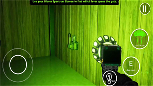 2. 游戏的操作非常简单。左侧的按钮是负责控制角色的前后左右移动,而右侧的【E】键则用于开门或射击。你还可以使用灯具按钮来照亮周围的黑暗角落。