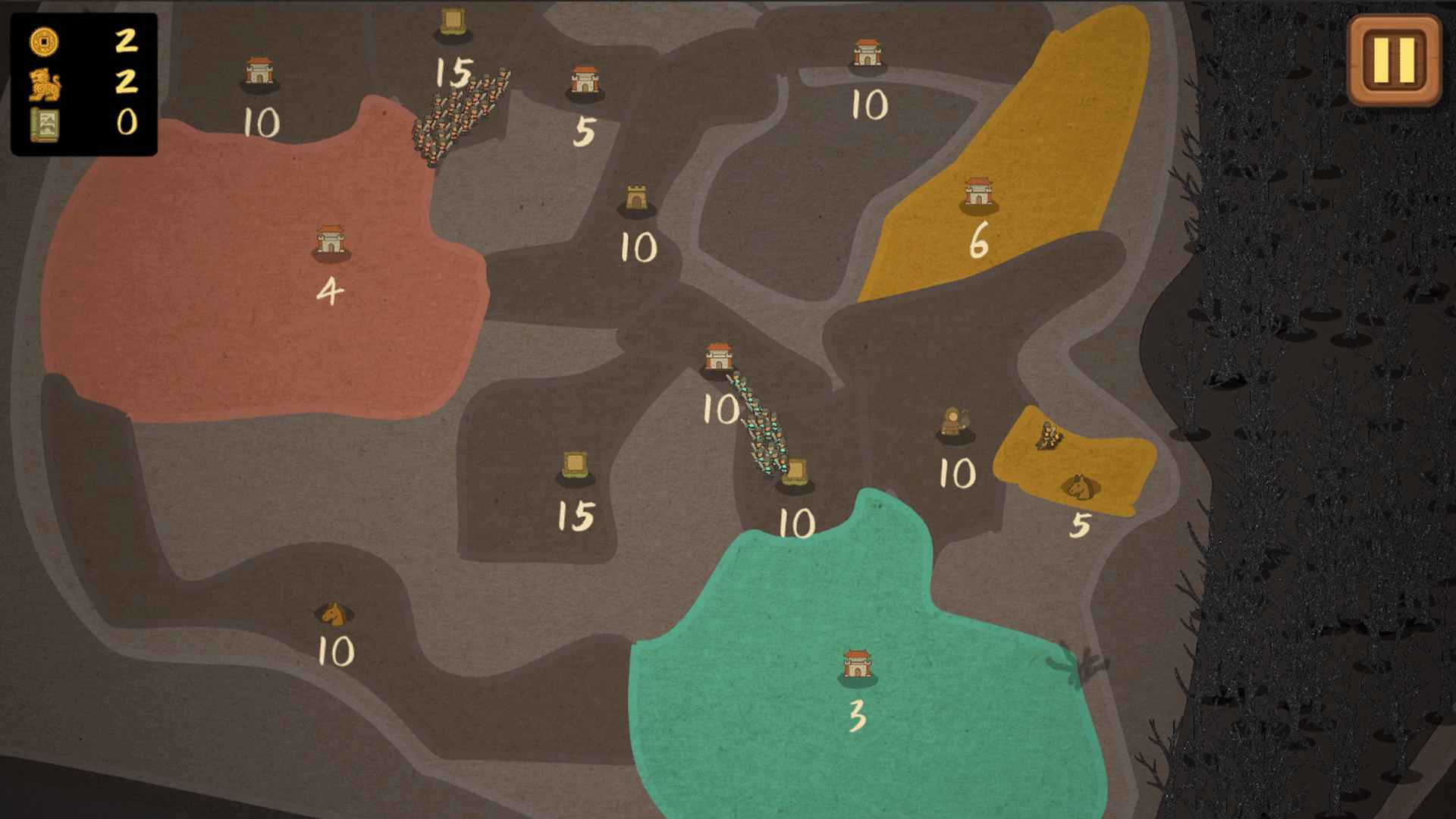4. 调兵时,出兵城池的守军将仅保留1人,形成”倾巢而出”的攻守博弈。玩家需预判敌方动向:既可趁对手刚占领城池、立足未稳时突袭,也能冒险清空己方城池发动闪电战。空白城池可直接占领,但需警惕对手螳螂捕蝉,是优先巩固后方,还是孤注一掷抢夺关键点,全凭战场嗅觉。