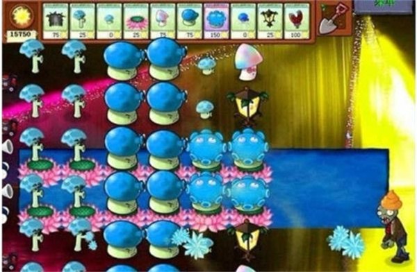 注:如果这一关出现气球僵尸的话,把吸钱蘑菇上面的那个种上菖蒲就可以了。如果出现蹦极僵尸或篮球车的话,在第2行第2格、第2行第5格、第5行第2格、第5行第5格的花铲掉,种上那种会张开的萝卜。