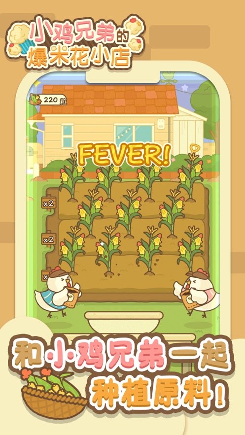 小鸡兄弟的爆米花店铺中文版游戏中所有的顾客角色都是圆滚滚的小鸡形象,和小鸡兄弟一起制作不同口味的爆米花进行贩卖,而做爆米花的玉米全都是玩家亲自种植,收割,最后一粒一粒剥出来的不停的晃动锅子来保持最佳火候,售卖更多的爆米花,赚更多的收益.