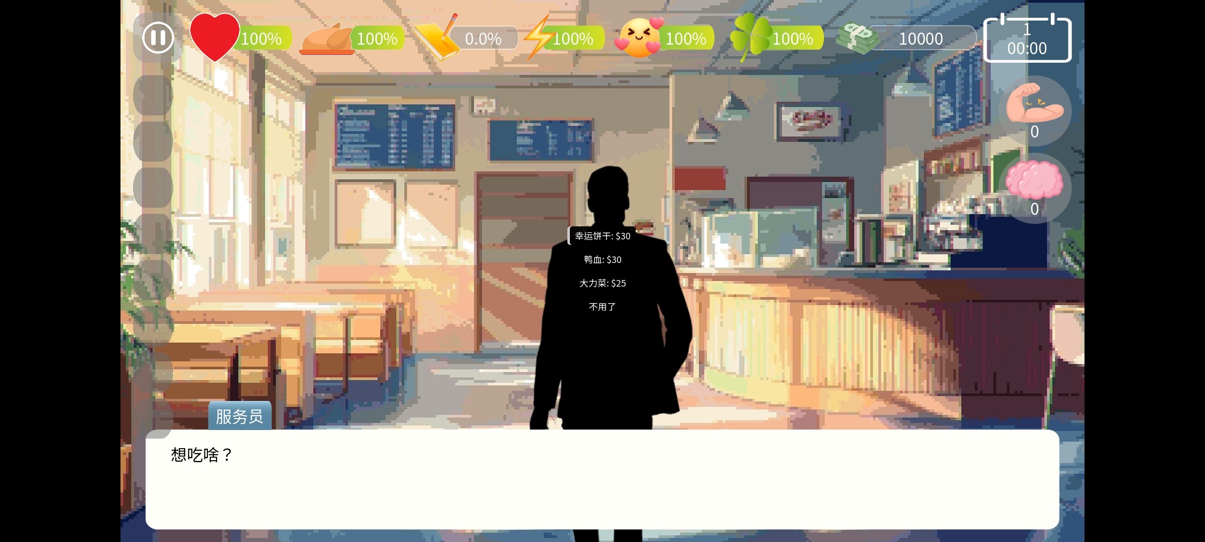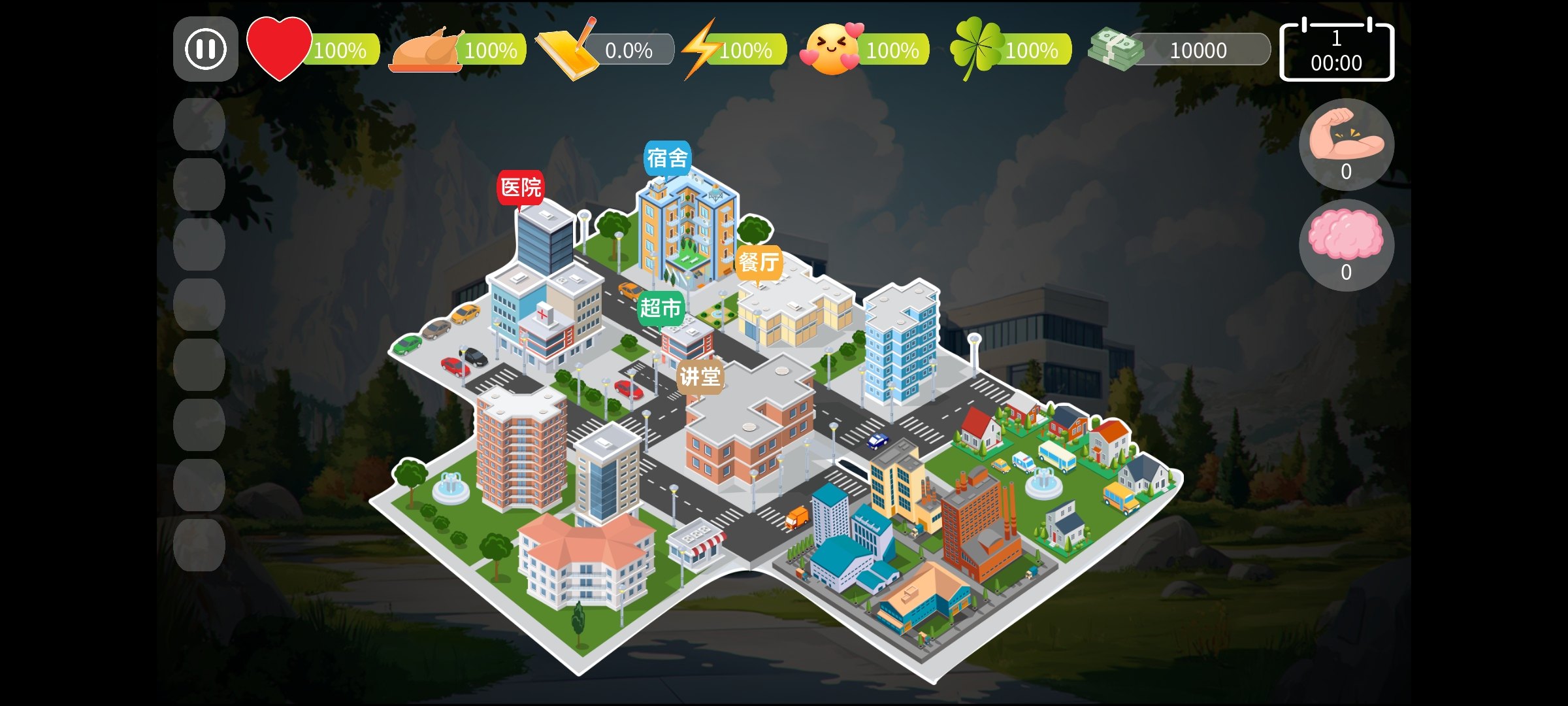 2. 游戏中就五个地点能选择,宿舍、讲堂、超市、餐厅、医院,就真如同一般上学一样,每天上课、吃饭、睡觉,然后完成毕业论文,但游戏中血量、饥饿、精神归零时就会结束人生,去食堂吃饭时要带上老鼠试毒避免中毒身亡,去超市时要多买些小刀防身,避免被人打劫钱、命和论文。