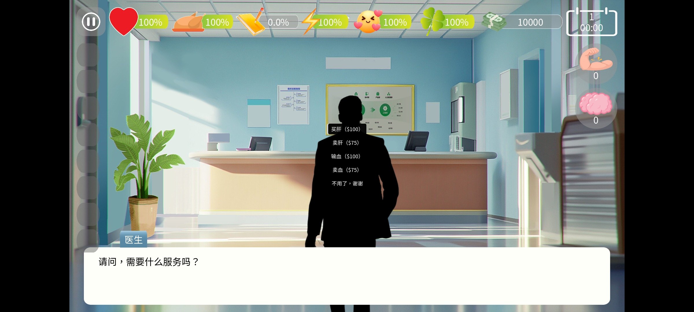 3. 游戏虽然一开始会给你固定的10000块消费,但基本远远不够,而游戏中为数不多挣钱的方法就是去医院卖肝卖血,你甚至还能通过买肝输血回血提升精神。