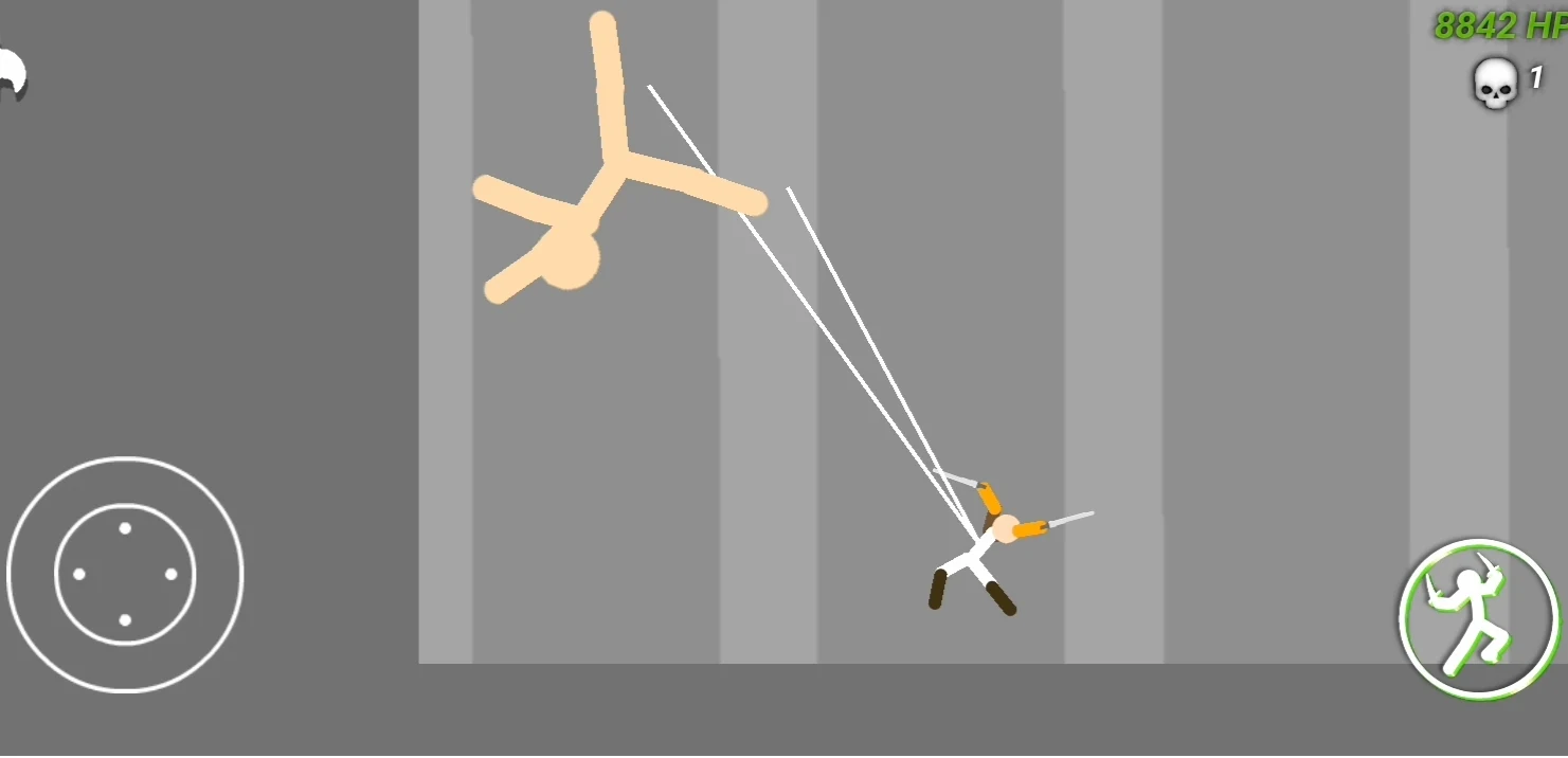 1. 在本站下载安装该游戏的最新版本,打开进入游戏,左边的箭头是控制方向的,右边的分别是跳跃和攻击,跳跃时能像蜘蛛侠一样弹射出绳子。