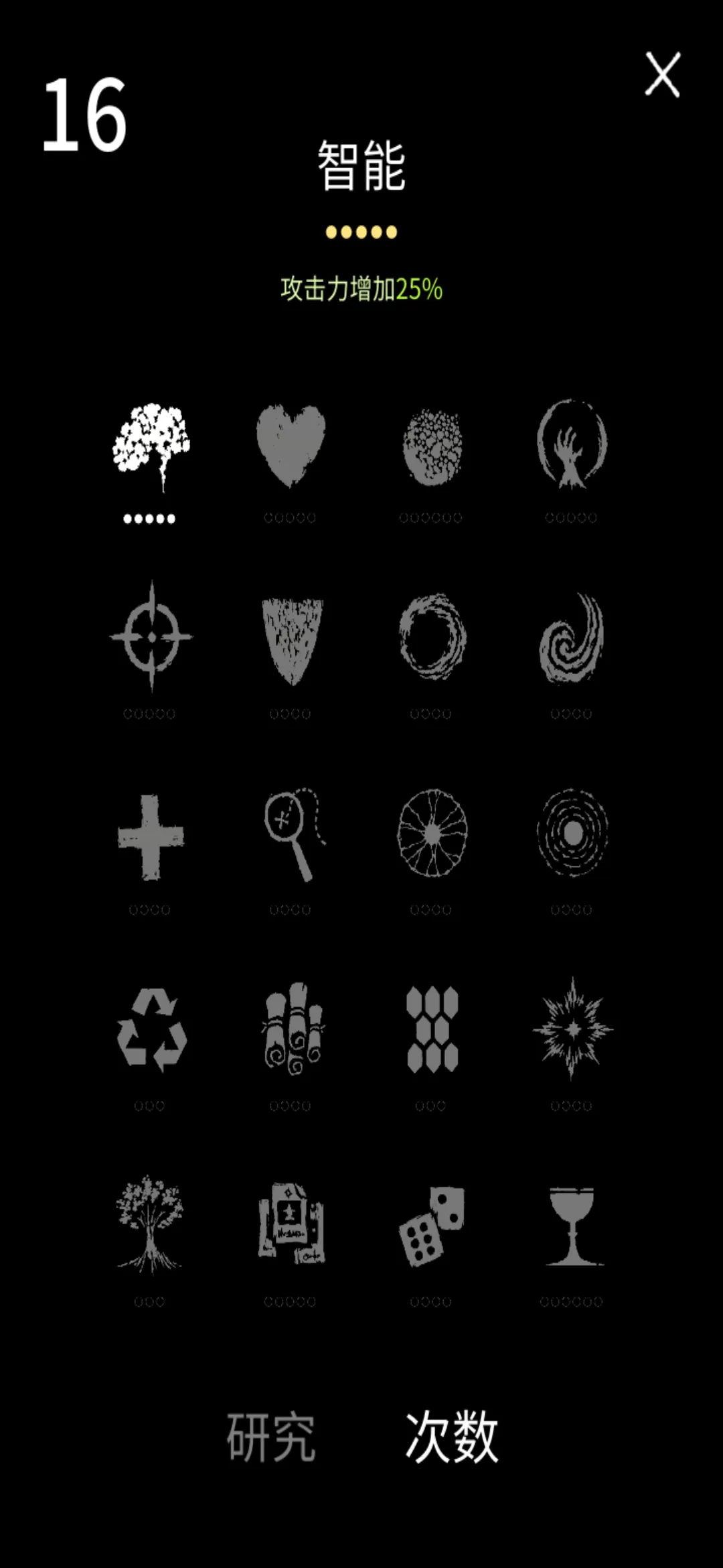 2. 首先是研究,有24个属性,不同的属性所增加的能力也截然不同,比如第一个是智力,它增加的是攻击,而第二个是作战驾驭,增加施法速度等等。