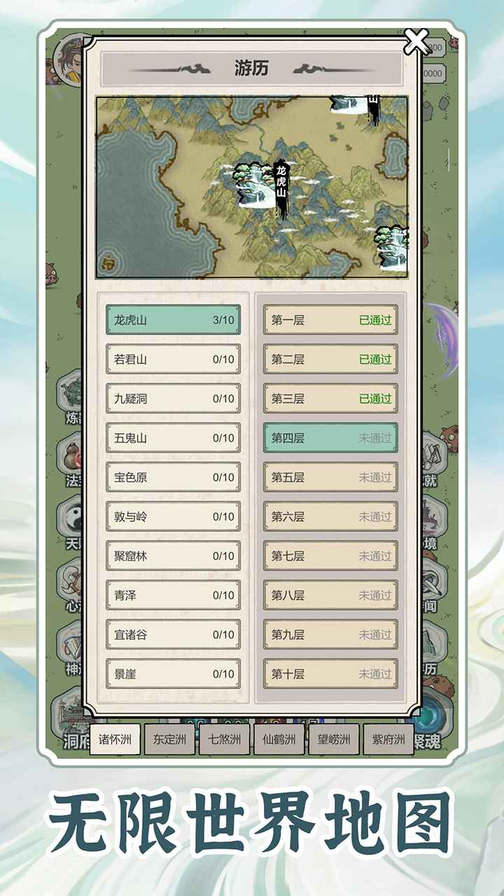 2. 玩法除了常规游历推关之外,还有异闻、洞府和秘境等内容,大部分玩法都是同推关一样,进地图放着自己打,基本没什么操作,洞府主要涉及到的是养成。内容不算多,适合当副游玩。