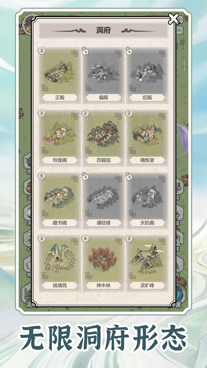 6. 洞府主要是放置资源产出,总计九个建筑,可以消耗资源解锁和升级,养成比较缓慢。