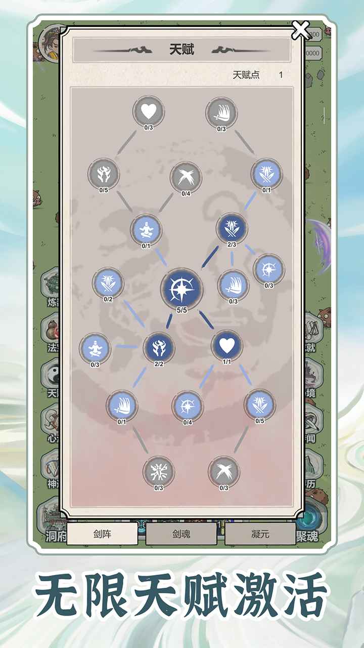 1. 修仙题材的放置类游戏,全程自动打怪,无需手动操作。在线点一点养成,进行一些玩法即可,休闲不氪非常养肝。表现上有割草的战斗爽感,培养的频率较高,基本上一分钟内就会有可点击的红点出现,异闻副本最多也就一分钟,靠数值的粘性来提高留存和在线时长。