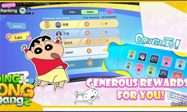 蜡笔小新叮当当英文名称叫做DingDongDang,游戏以蜡笔小新为题材,为玩家们打造了一个休闲益智的跑酷闯关游戏,在游戏中玩家们将需要选择自己喜欢的角色来进行各种跑酷,努力躲避前进道路上的危险与障碍物,收集各种道具资源,努力到达终点即可。此外本款游戏支持多人联机的玩法模式,玩家可以与好友一起开启有趣的跑酷之旅!