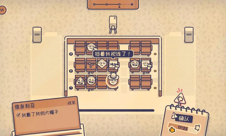 这个座位有人坐吗小游戏采用手绘画风,这是一款休闲治愈类解谜游戏,玩法规则简单且通俗易懂,玩家需要做的就是给一群怪性格的人物排座位,每个人的性格和喜好不一,有的喜欢靠窗、有的喜欢独自一人坐,帮助小人满足需求合理的分配座位。