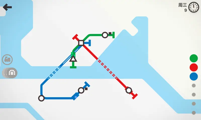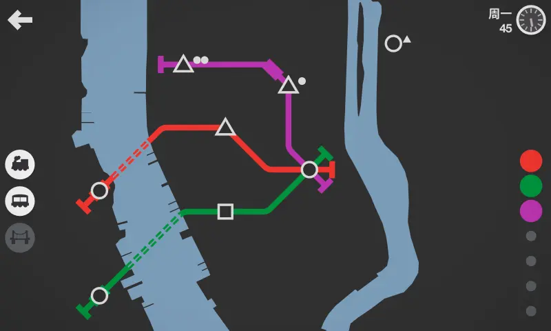 迷你地铁游戏初始拥有3条线路与3辆列车,以及若干数量的桥梁或隧道,彩色小圆点即是当前拥有的线路,灰色表示还没有解锁,不同图标代表不同类型的站点,详细解析可在后文查阅,在各个站点的右上角标表示这个站点的人想要去的站点,我们所要做的就是连接路线解决供求。