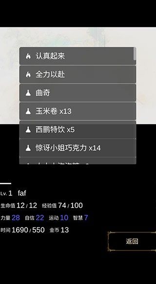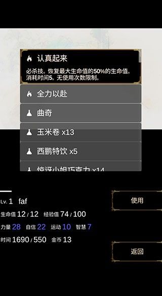 2. 左下角是自己的等级、生命值、时间、金币以及经验值等信息,你会遇到很多随机事件,可以选择战斗或者逃跑。
