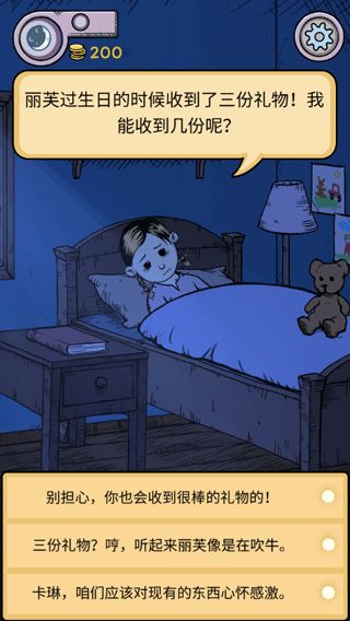 9、卡琳希望打开礼物再睡觉,可以选择第二个选项